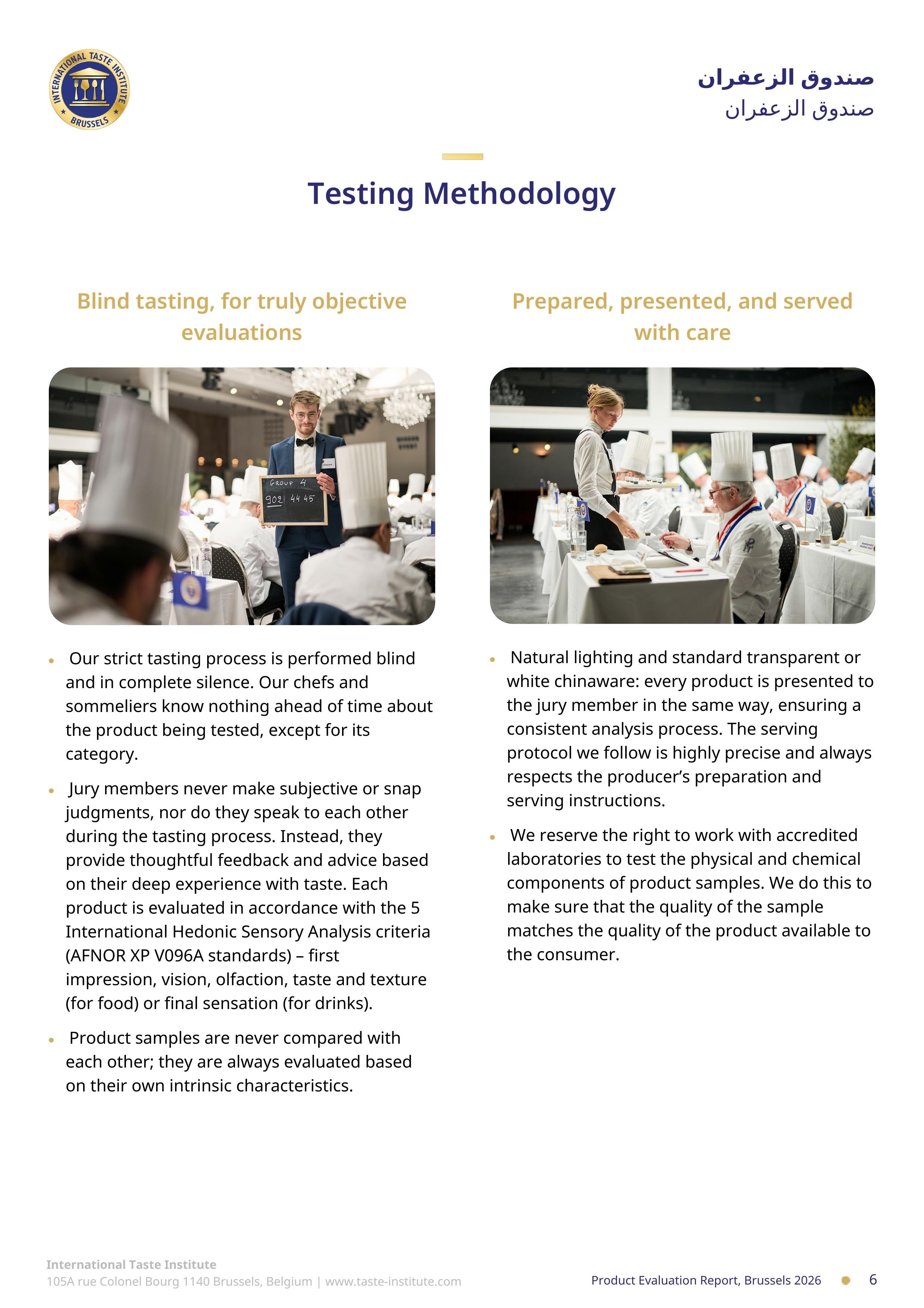 - الإضاءة الطبيعية والأواني الصينية البيضاء أو الشفافة القياسية: يتم تقديم كل منتج لكل عضو في لجنة التحكيم بنفس الطريقة، مما يضمن عملية تحليل متسقة.