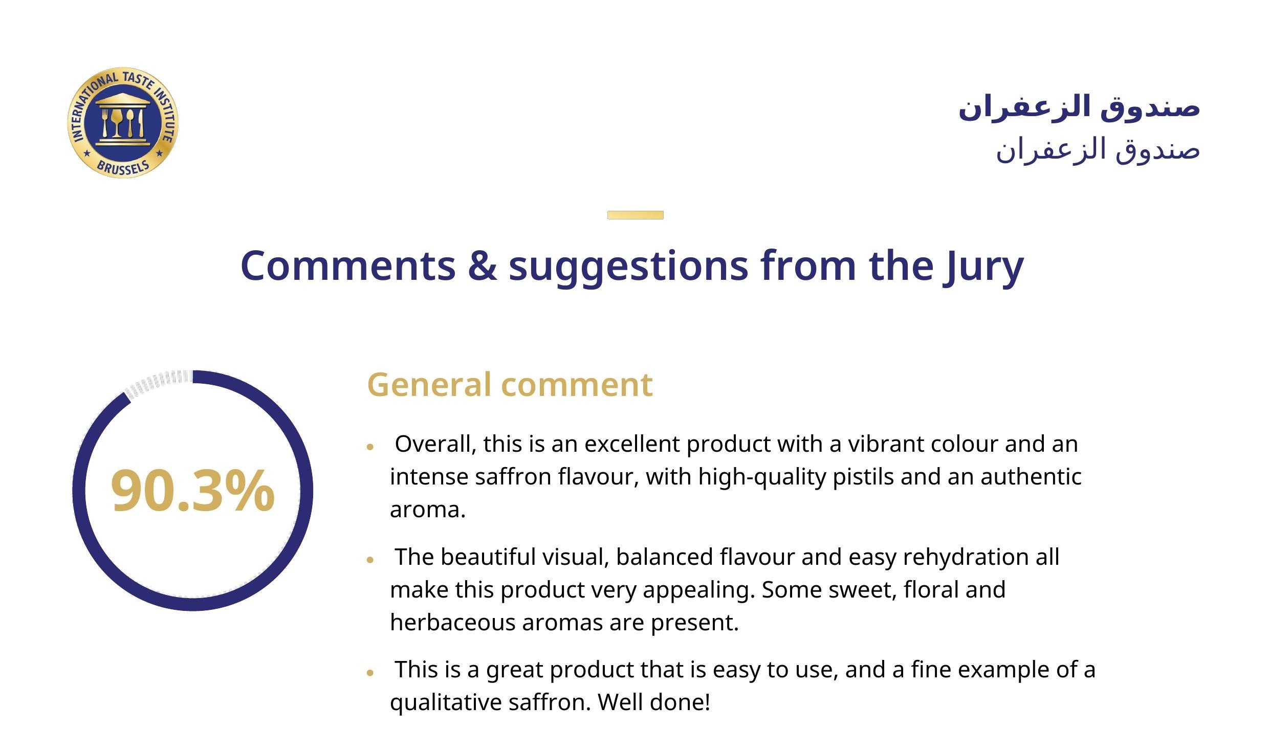 - بشكل عام، هذا منتج ممتاز بلون نابض بالحياة ونكهة زعفران مكثفة، مع مياسم عالية الجودة ورائحة أصيلة.