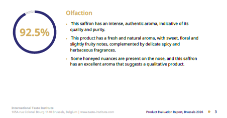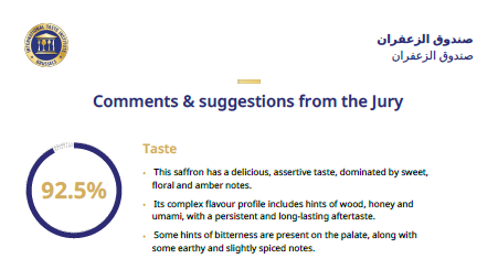 - يتمتع هذا الزعفران بطعم لذيذ وقوي، تهيمن عليه نغمات حلوة وزهرية وعنبرية.
