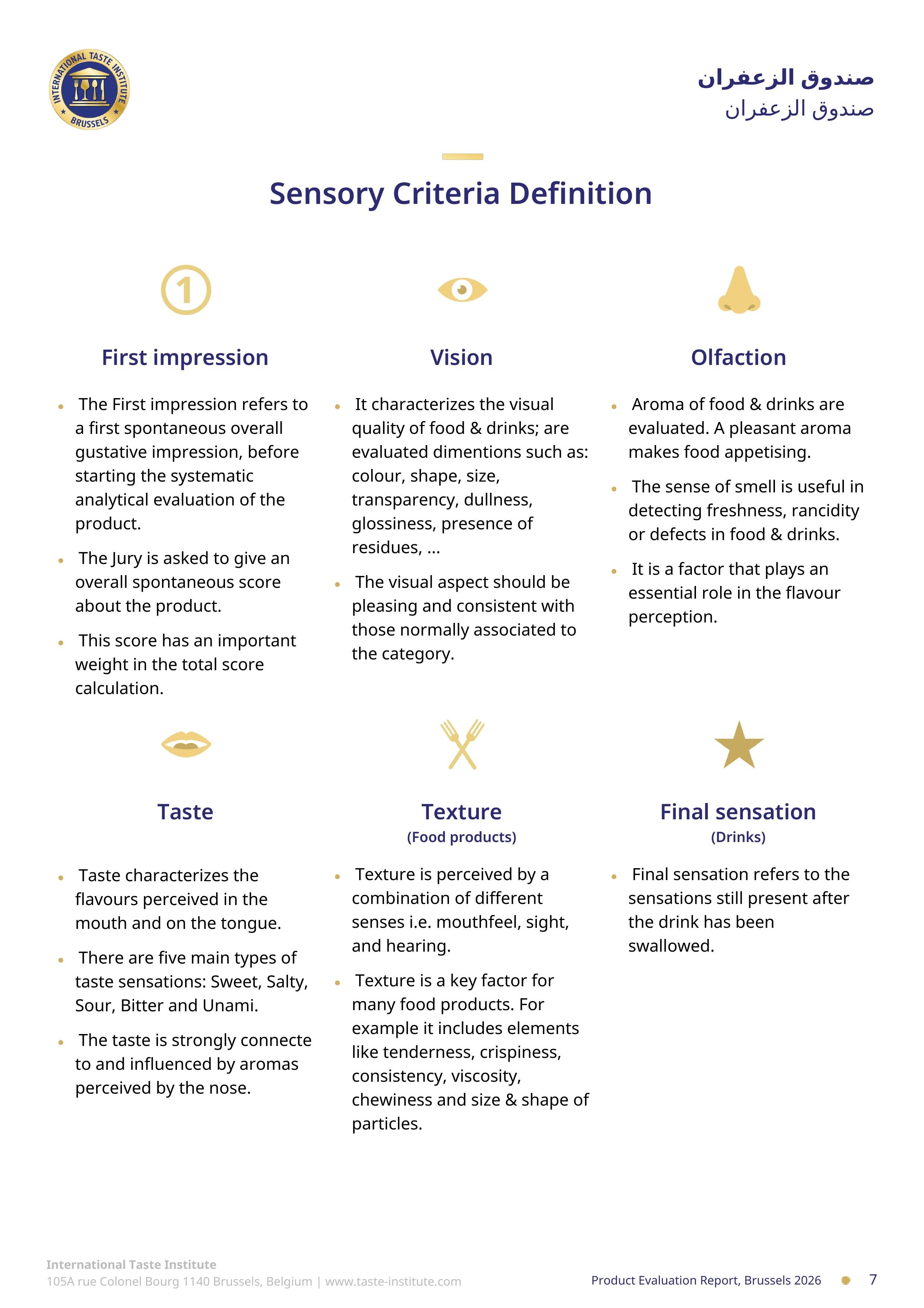 - 1. الانطباع الأول: يشير إلى الانطباع الذوقي العام الأول التلقائي، قبل البدء في التقييم التحليلي المنهجي للمنتج. يُطلب من لجنة التحكيم إعطاء درجة تلقائية إجمالية للمنتج. هذه الدرجة لها وزن مهم في حساب الدرجة الإجمالية.